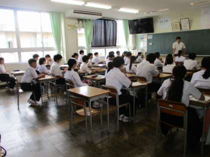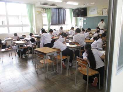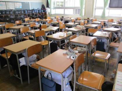 今日は防災の日です。今朝の速星タイムの時間は「シェイクアウト訓練」を行いました。地震発生の放送を受けると同時に、低い姿勢を取って頭を守り、動かないようにします。写真は16Hの様子です。皆、真剣に取り組んでいました。
