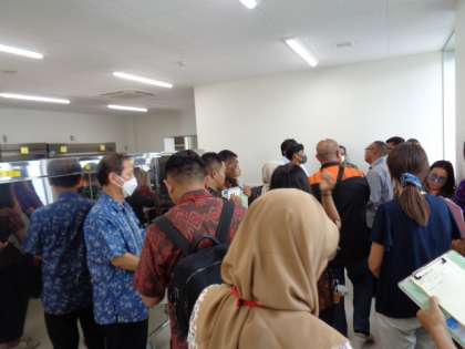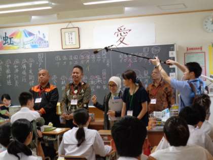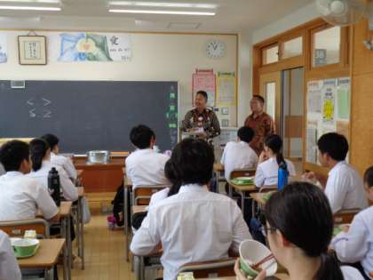 給食時間に生徒と交流しました。配膳室に入って片付けを見られました。