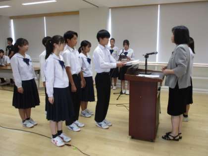 6限、生徒会役員任命式を会議室からのリモート配信で行いました。旧の生徒会長の挨拶の後、教頭先生から新生徒会長と執行委員に任命証が手渡されました。