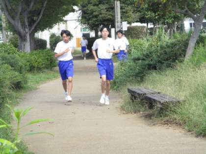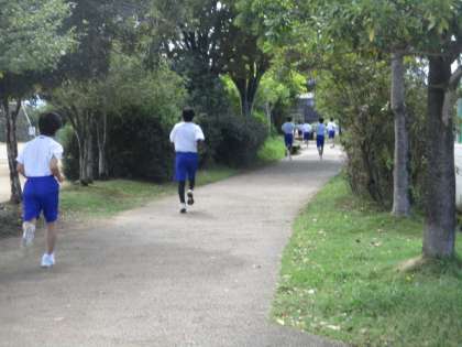 2限33、34Hの男子体育の様子です。スポーツプラザの周囲を走る持久走で、タイムを測定しています。