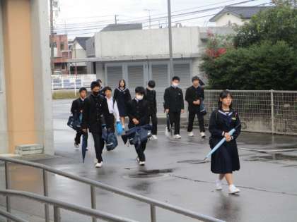 今朝の登校時は小雨から曇りになりました。今日から冬服に完全移行になります。本日の下校完了時間は16:30です。