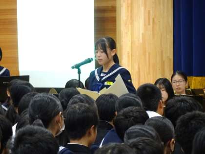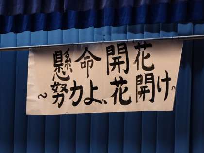 学習発表会が始まりました。生徒会スローガンは「懸命開花」です。