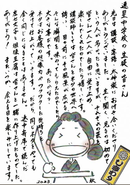 10/19(木)のPTA芸術鑑賞会で「速中寄席」で講談いただいた「日向ひまわり」さんから、速中生に向けて嬉しいメッセージをいただきました。