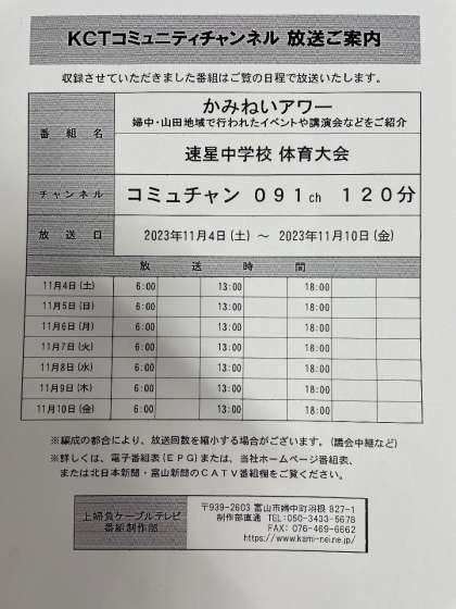 【上婦負ケーブルテレビから】第77回体育大会の放映について