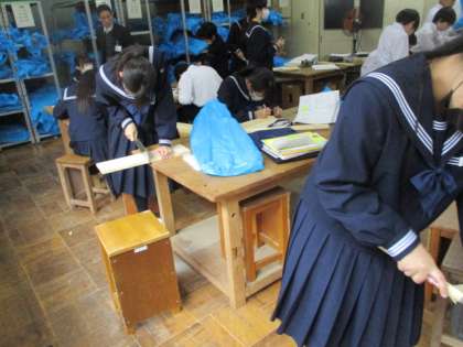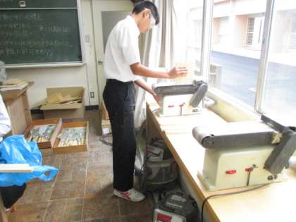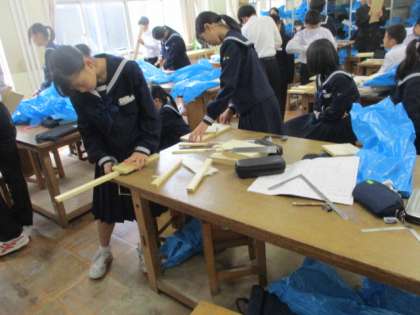 ラックの製作に向けて木材の加工が進んでいます。のこぎりを使って木材を切る作業は、初めて経験する生徒も多いようです。