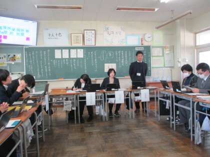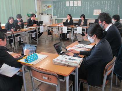 放課後は学年ごとに先生方が集まり、今日の授業について協議しました。最後に外部から来ていただいた先生からも指導助言をしていた。