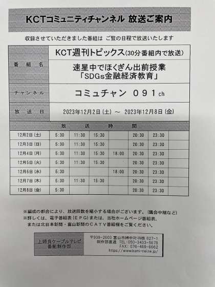 先般開催しました、ほくぎん出前教室「SDGs金融経済教育」(第2学年家庭科)について、上婦負ケーブルテレビから放映日時の連絡がありましたので、お知らせします。