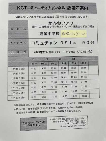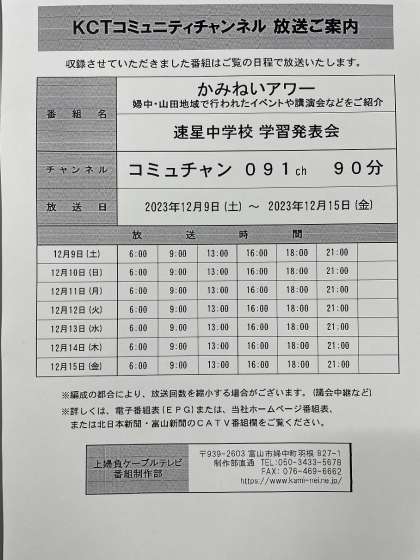 先般開催しました「学習発表会」ならびに「合唱コンクール」について、上婦負ケーブルテレビから放映日時の連絡がありましたので、お知らせします。