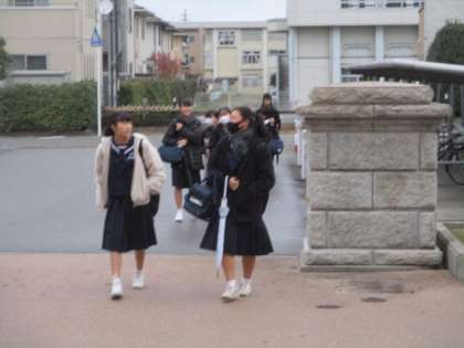 今朝の登校時は曇りになりました。生活向上委員会の生徒が大きな声で挨拶をしています。本日の下校完了時間は16:30です。