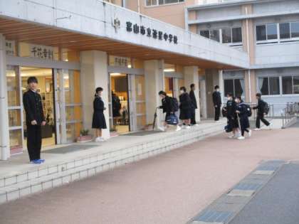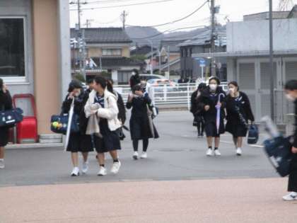 今朝の登校時は曇りになりました。生活向上委員会の生徒が大きな声で挨拶をしています。本日の下校完了時間は16:30です。