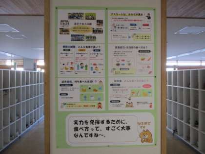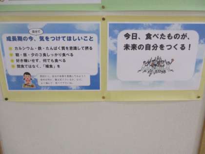 保健室前の廊下の掲示物が新しくなりました。先日の学校保健委員会でテーマになった「成長期の食事」についての掲示です。運動部の試合前や受験期の食事のアドバイスもとても参考になります。