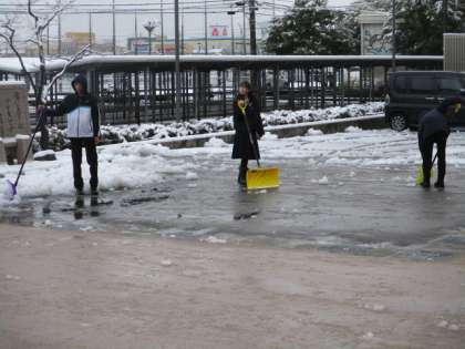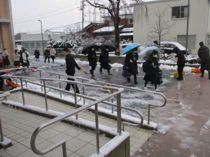今朝は雪になりました。初めて除雪当番のクラスが活躍しました。今日から保護者懇談会が始まります。本日の下校完了時間は15:00です。