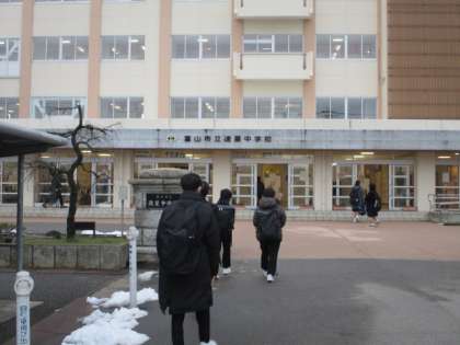 今朝の登校時は曇りになりました。玄関前にはまだ昨日の雪が残っています。本日の下校完了時刻は15:00です。