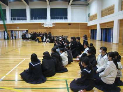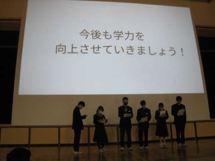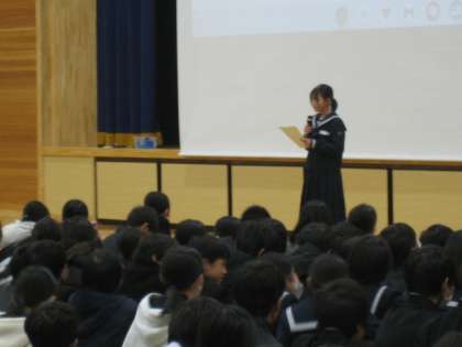 学年生徒会から学習と挨拶についての活動報告と、後半にはお楽しみ企画としてクリスマスにちなんだ曲のイントロクイズが行われました。イントロクイズでは、各クラス代表者を応援し大変盛り上がりました。