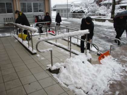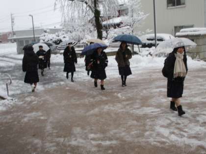 今朝の登校時は雪になりました。除雪当番のクラスが頑張っています。本日の下校完了時間は12:00です。