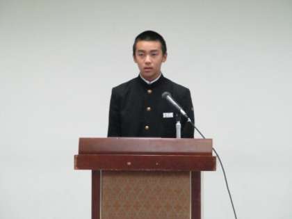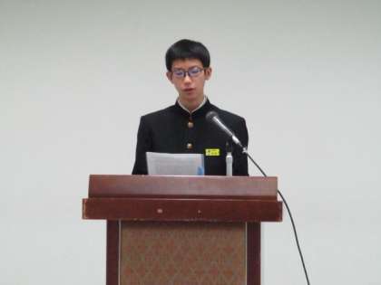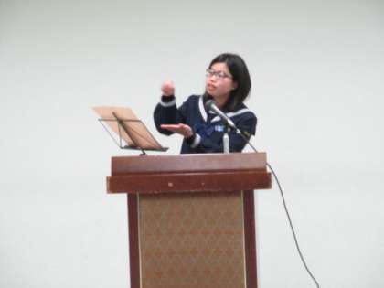 受賞報告会に続いて意見発表会を行いました。1、3年生の代表者は2学期の行事等で体験したことから学んだことや今後の目標について発表しました。2年生は「心の輪を広げる体験作文」で富山県中学生の部最優秀賞を受賞した生徒が自らの手話体験で感じたことを手話を交えながら発表しました。