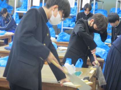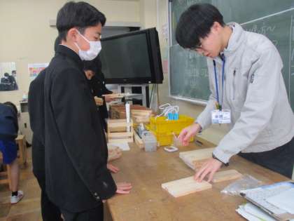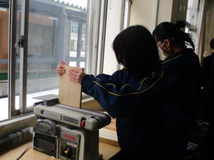 先生のアドバイスを受けながら、安全に気を付けて木材を切ったり削ったりしています。