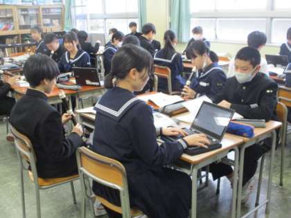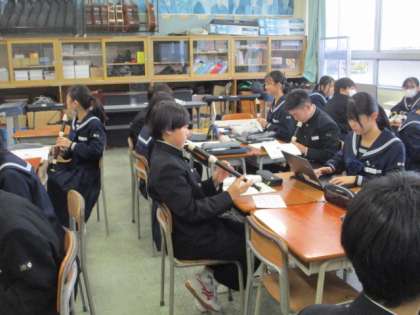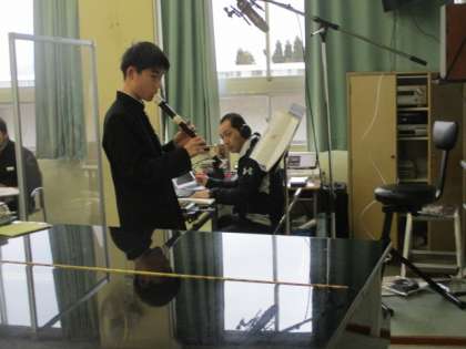 2限、14Hの音楽の時間の様子です。アルトリコーダの演奏のテストを行っています。他の生徒は練習中です。