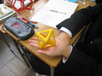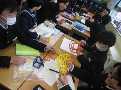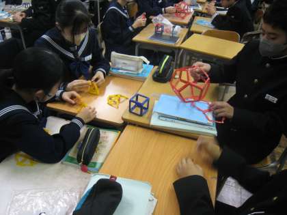 写真は、班で正多面体をつくる様子です。(11H、12H、18H)