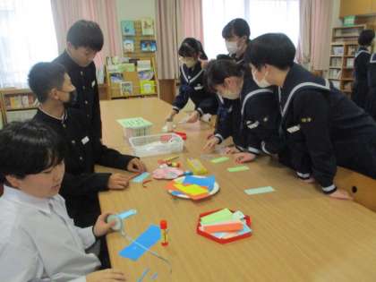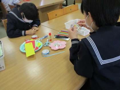 昼休み、図書室で図書委員会の企画「世界で一つだけのしおりをつくろう」が開催されました。今日は1年生が対象です。生徒たちは思い思いのデザインのしおりを制作しました。