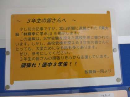 A棟1階の東西の階段付近に3年生に向けて、富山新聞に掲載された『東大脳「林輝幸に学ぶ」』の切り抜きが掲示されています。受験を前にした3年生に参考になることがたくさんあります。