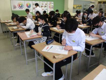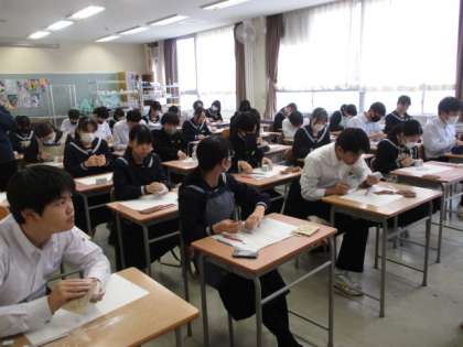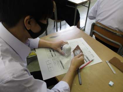 3限、36Hの美術の時間の様子です。石彫を行っています。紙やすり等を用いて石を削りながら形を整えます。