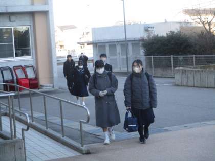 今朝の登校時は晴れになりました。今日から学年末考査期間に入るため部活動は停止になります。本日の下校完了時間は14:45です。