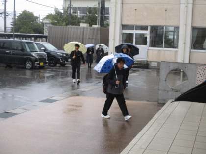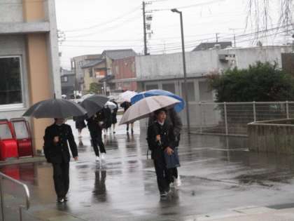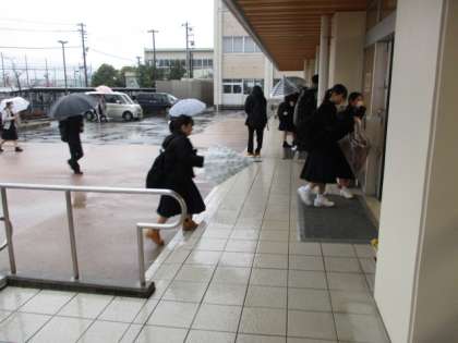 今朝の登校時は雨になりました。今日から学年末考査が始まります。本日の下校完了時間は13:15です。