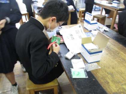 3限、22H技術の様子です。ラジオを製作しています。基盤に部品をはんだ付けしていきます。
