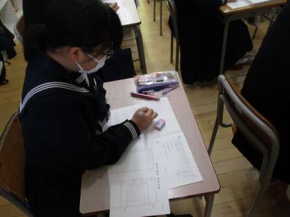 3限、34H数学の様子です。県立高校の一般入試を前に、プリントで入試の模擬問題を解いています。