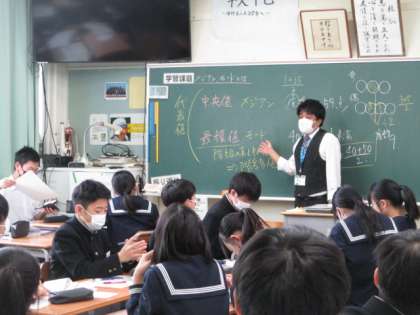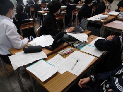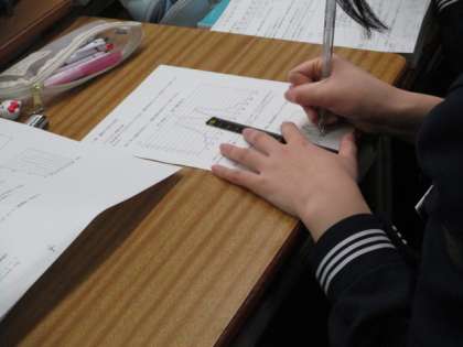 3限、16Hの様子です。メジアン(中央値)とモード(最頻値)について学習しています、資料を使って実際に値を求めています。
