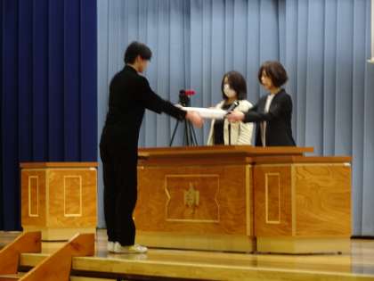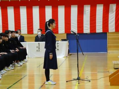 同窓会入会式の後、卒業記念品贈呈式を行いました。PTA記念品としてPTA会長から卒業証書を入れるフォルダをいただきました。生徒代表は、未来に向けて一歩一歩前進したいと述べました。