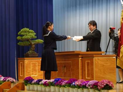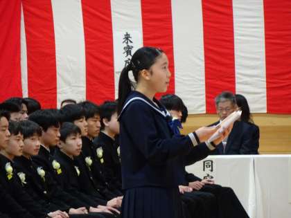 卒業生代表による答辞です。3年間の多くの思い出を振り返るとともに、新たな旅立ちへの決意を述べました。卒業の歌は「群青」です。