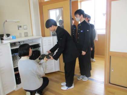 5限にタブレットパソコンを移動しました。2年生が3年生の使用していたタブレットを1年生の教室に移動しています。これは来年度入学する新1年生が使用します。