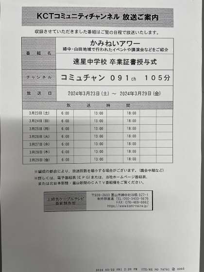 先般挙行しました「卒業証書授与式」について、上婦負ケーブルテレビから放映日時の連絡がありましたので、お知らせします。