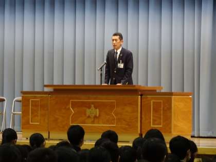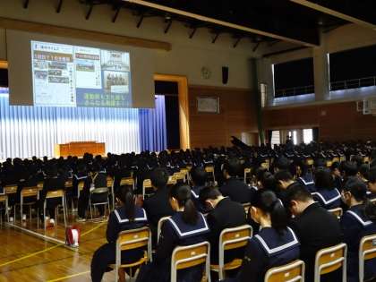 1限、体育館で創校記念式を行いました。鍋田校長は中学生時代にサッカーを通して速星中学校と関わりがあったことなどを話されました。その後、生徒会執行部が速星中学校の歴史をスライドで振り返りました。