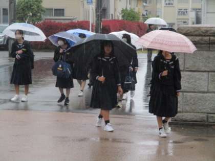 今朝の登校時は比較的強い雨になりました。今日は全クラスで生徒会の活動計画案の学級討議を行います。本日の下校完了時間は17:40です。