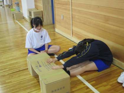 4限、13Hの授業の様子です。スポーツテストを行っています。男子は反復横跳び、女子は長座体前屈の測定をしました。