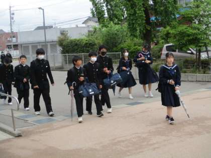 今朝の登校時は曇りになりました。今日は6限に小学校の先生方が来校されて小中連絡会を行い、1年生の授業を参観される予定です。本日の下校完了時間は16:55です。