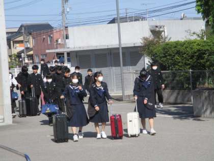 今朝の登校時は晴れになりました。今日は午後から3年生の修学旅行出発式と荷物の積み込みを行います。本日の下校完了時間は17:40です。