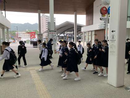 宮島口に到着して、バスに乗り込み広島駅に向かっています。