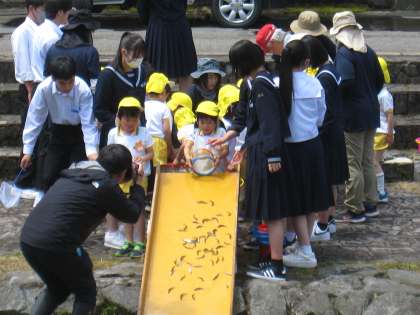生徒の中には、10年ぐらい前に自身が、この場で稚鮎放流事業に参加した生徒もいました。