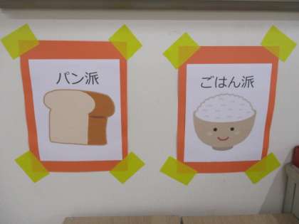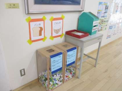 生徒会コーナーにはボランティア委員会が行っているペットボトルキャップの回収箱が設置されています。持参した人はご飯派かパン派か、いずれかの箱に入れます。現在はパン派が勝っているようです。