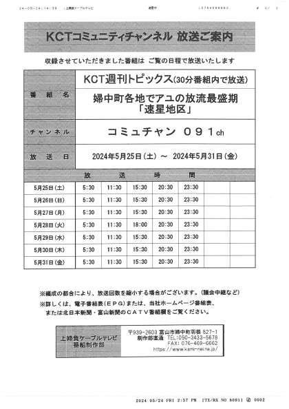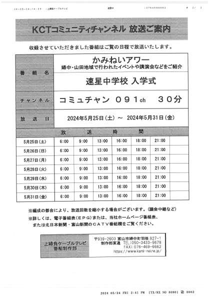 「入学式」「園児とのアユの放流活動(36H)」について、上婦負ケーブルテレビから放映日時の連絡がありましたので、お知らせします。