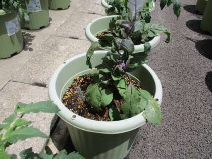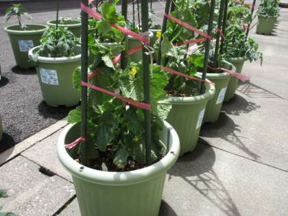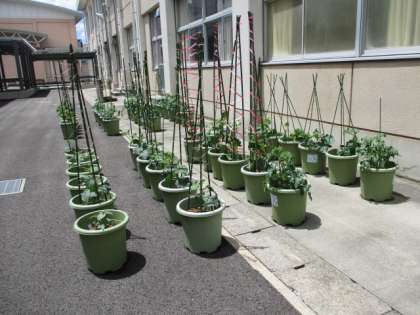 金工室と体育館の間のスペースでは2年生が班に一鉢ずつ、夏野菜を栽培しています。きゅうりやなすなど、小さかった苗も少しずつ成長してきました。