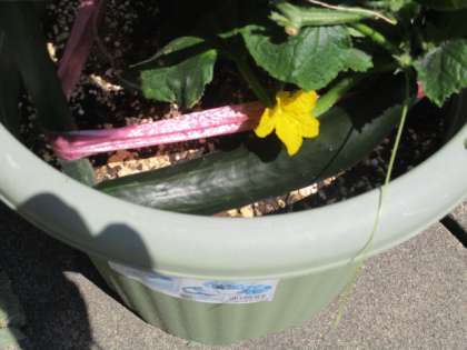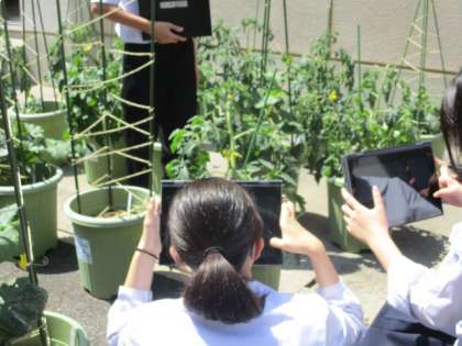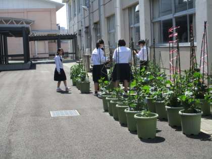 5限、22Hの技術の時間です。班で植えた夏野菜の成長を観察しています。きゅうりが実っていました。
