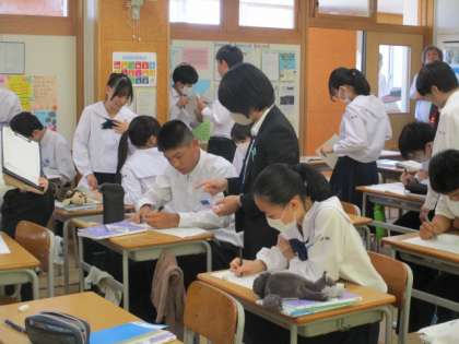 2限、39Hで教育実習生が数学の研究授業を行いました。学習課題は「根号のついた数を近似値を使ってあらわそう」です。生徒は友達と教え合いながら問題を解いていました。