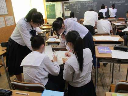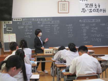 2限、39Hで教育実習生が数学の研究授業を行いました。学習課題は「根号のついた数を近似値を使ってあらわそう」です。生徒は友達と教え合いながら問題を解いていました。