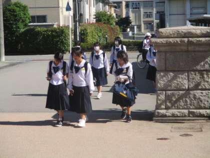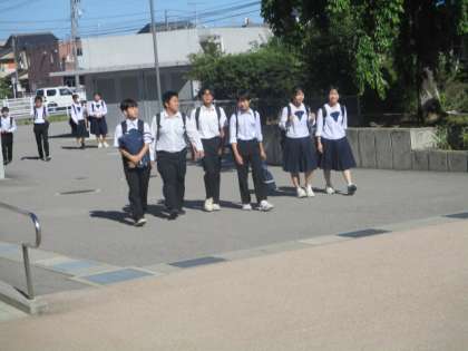 今朝の登校時は晴れになりました。今日は2年生の多くの生徒が「14歳の挑戦」の事業所の事前訪問を行います。本日の下校完了時間は16:15です。