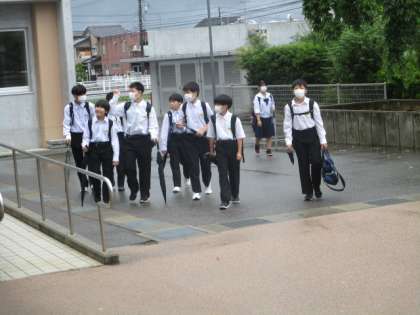 今朝の登校時は小雨から曇りになりました。今日から1学期期末考査が始まります。本日の下校完了時間は14:10です。